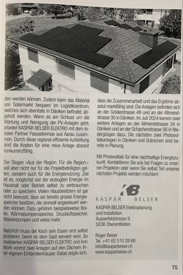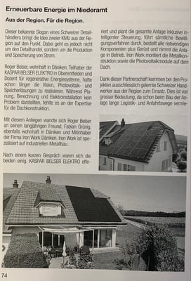 In der 285. Ausgabe des Däniker Spate ist letzte Woche ein Bericht über unsere Photovoltaikprojekte in Zusammenarbeit mit der Firma Iron Work erschienen. Der Artikel beschreibt nicht nur die Realisierung der PV-Anlagen, sondern auch die Entstehung einer erfolgreichen Partnerschaft zwischen zwei langjährigen Freunden aus Däniken.